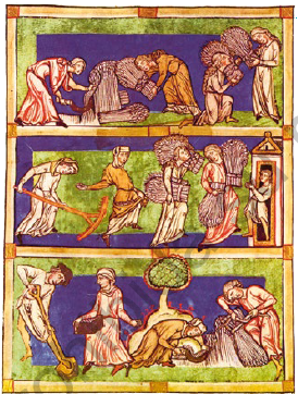 Ilustración de una "cosecha", presente en un manuscrito medieval del siglo XIII. En ellla se muestran las tres condiciones de la mujer medieval: las vírgenes que se dedican a Cristo, las viudas piadosas y las piadosas esposas, todas cosechando distintas cantidades de productos.